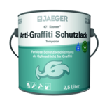 Graffiti Entferner 470, Anti Graffiti Schutzlack temporär 471 und 2K Anti Graffiti Schutzlack permanent 472 – mit dem neuen Anti-Graffiti-Baustein nimmt JAEGERLACKE unerwünschte Farbschmierereien ins Visier.