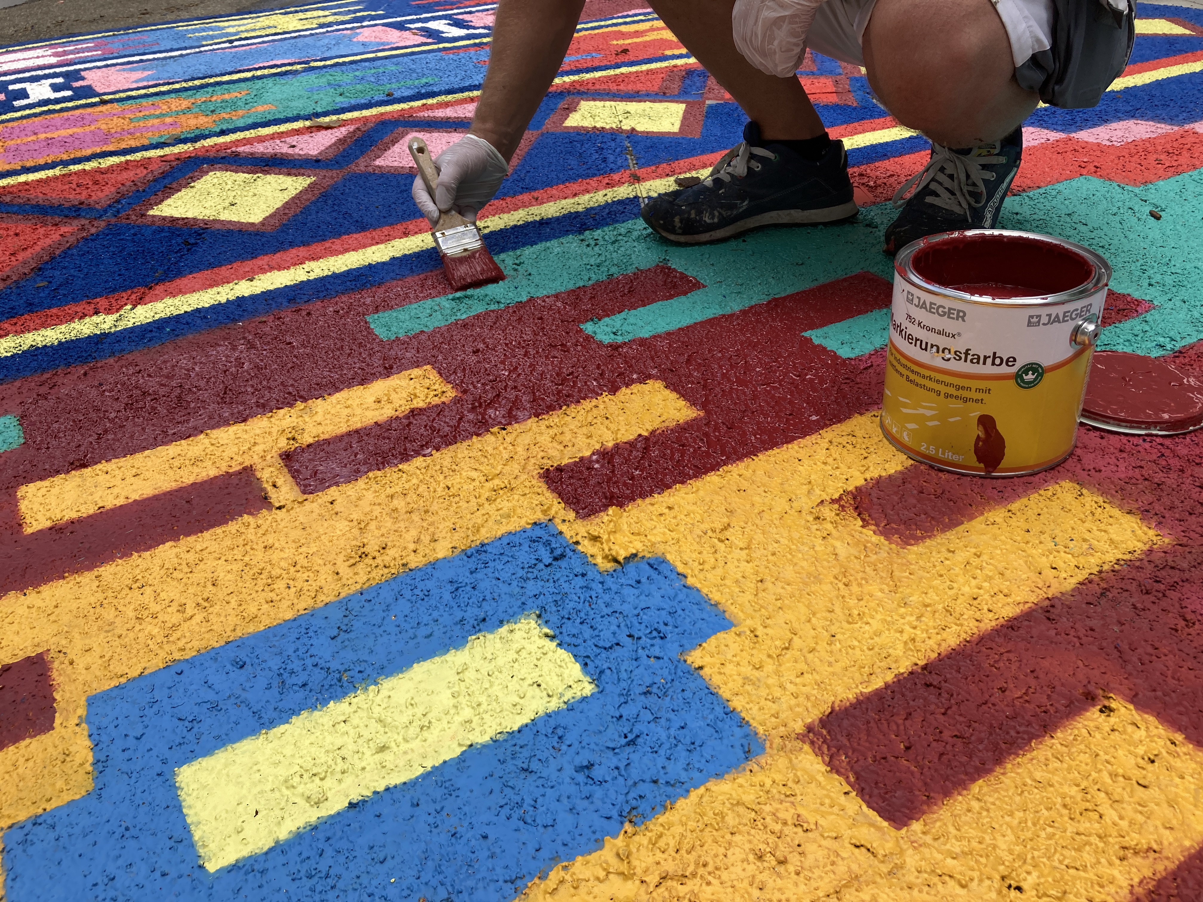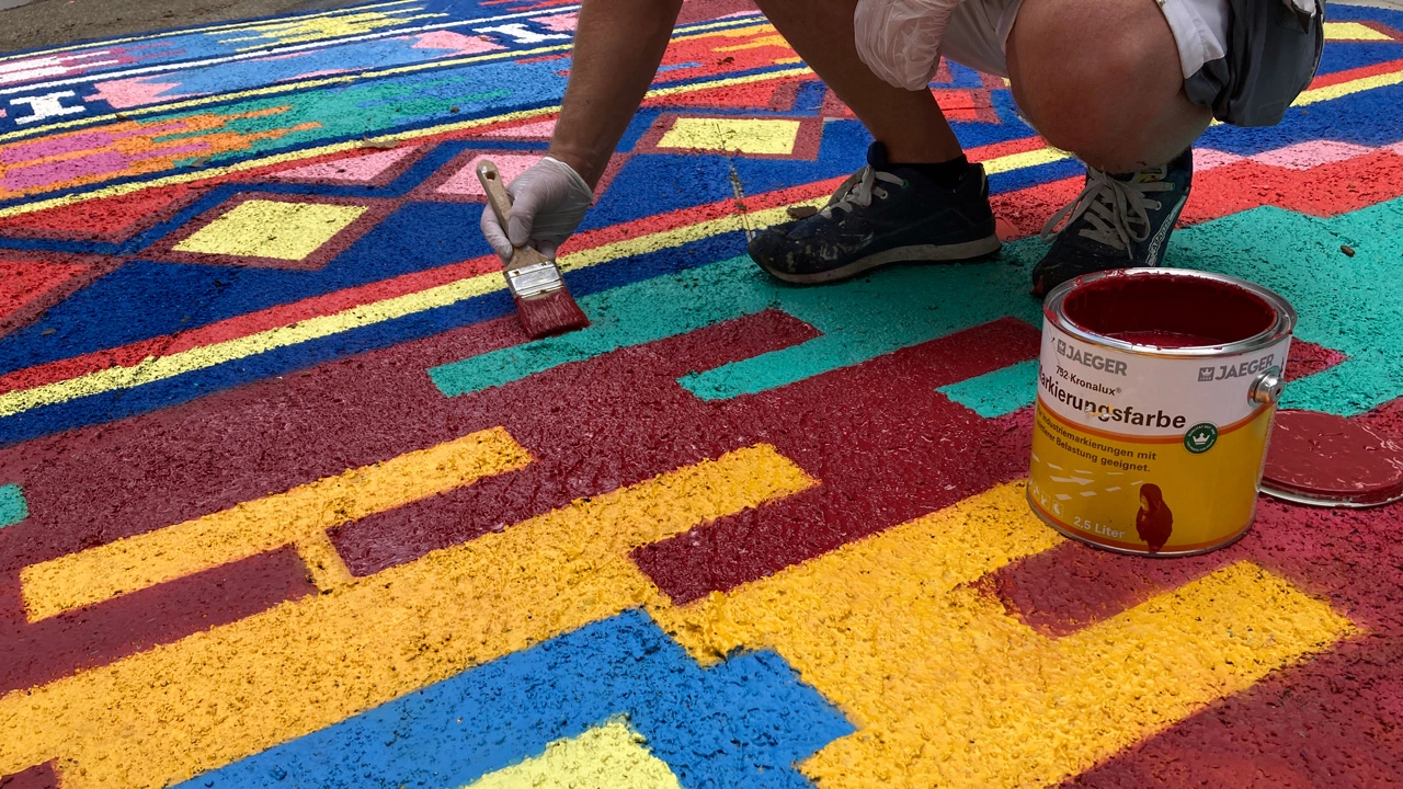 Damit die Farbbrillanz und Strahlkraft eines derart aufwändigen Kunstwerks unter freiem Himmel langfristig erhalten bleibt, kommt es nicht nur auf eine fachgerechte Ausführung an. Entscheidend ist auch die Wahl der eingesetzten Farben. Mit „763 Kronalux® 2K Rollplastik“ und „752 Kronalux® Markierungsfarbe“ aus dem JAEGERLACKE Sortiment ist das Kunstwerk bestens gegen Witterungseinflüsse und mechanische Beanspruchungen aller Art gewappnet.